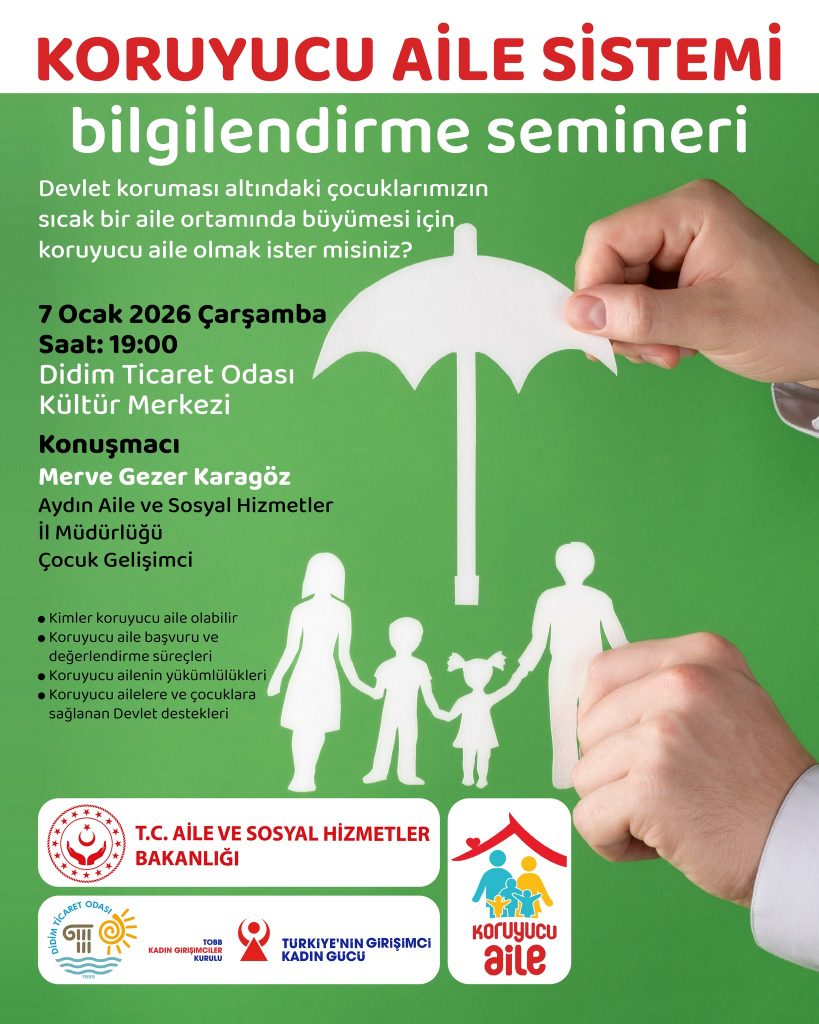 Kadın Girişimciler Kurulumuz Aydın Aile ve Sosyal Hizmetler İl Müdürlüğü ile Koruyucu Aile Hizmet Modelinin Didim’de tanıtımı ve yaygınlaştırılması amacıyla Bilgilendirme Seminerini planladı.